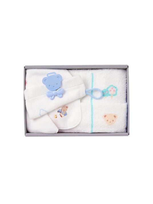 タオル・タオルハンカチ・バスミトン・クマクリップ・安全ピンが入ったギフトセット。
