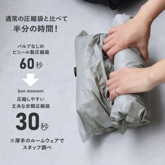 セレクチュアー株式会社2月15日(木)、bon moment から「圧縮しやすい 丈夫な衣類圧縮袋 2枚セット」が発売。まるで布地のような素材なので繰り返し使え、また排気バルブ付きで空気がスピーディーに抜けるスグレモノ!