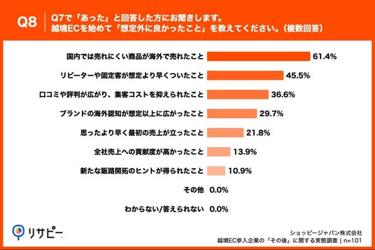 「Q8. Q7で「あった」と回答した方にお聞きします。越境ECを始めて「想定外に良かったこと」を教えてください。(複数回答)」(n=101)と質問したところ、
