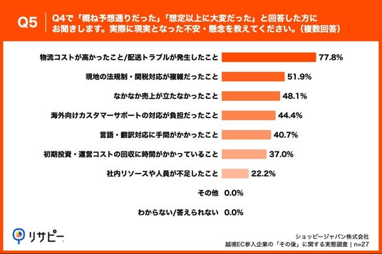 「物流コストが高かったこと/配送トラブルが発生したこと」が77.8%、「現地の法規制・関税対応が複雑だったこと」が51.9%、「なかなか売上が立たなかったこと」が48.1%という回答となりました。