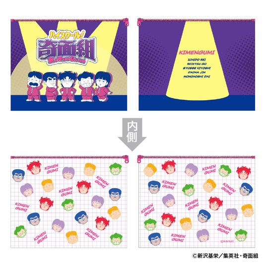 「奇面組」メンバーをレトロポップなテイストでデザイン。ジップを開けると内側に散りばめられたメンバーの顔がのぞく、遊び心あふれる両面プリントポーチです。