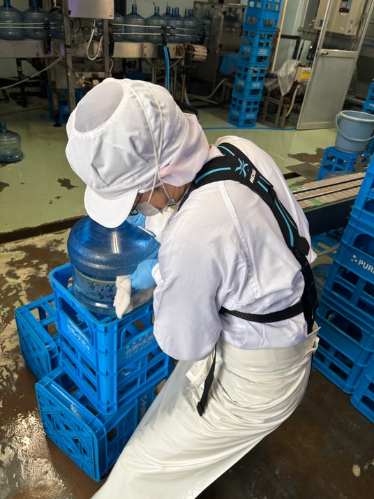 ■株式会社合馬天然水 担当 稲垣様からのコメント 工場での水の検品作業や機械の清掃で使用しています。作業は3名体制で、1日8時間のうち2~3時間は水を持つ作業を行っていますが、特に中腰になる作業が多く、身体的負担が大きいのが課題でした。特に12キロの水をラックに詰める作業は2時間以上続くため、腰に厳しさを感じます。このため、過去には腰痛や身体への負担が原因で退社した従業員もいます。