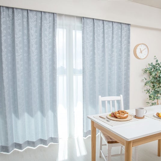 北欧テイストの植物デザインカーテン。立体感のある柄をジャカード織で表現した、柔らかな印象のドレープカーテンです。やわらかで明るい北欧カラーがナチュラルな空間にマッチする1枚。