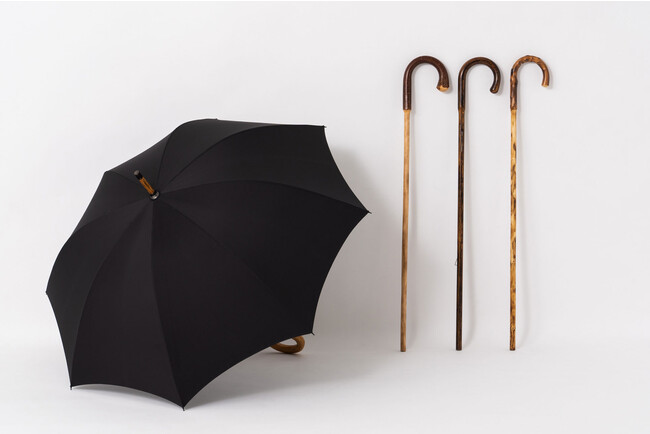 今回、多くの傘を展開する FOX UMBRELLAS のシリーズから、傘のハンドルから中棒までが一本の木から作られる「Solid」と呼ばれるタイプに注目。18世紀から19世紀にかけて多くの英国紳士の間でステッキがステータスシンボルの一つとして用いられており、それをモチーフとして作られたのが FOX UMBRELLAS 特有の細巻きの傘と言われています。そのため「Solid」は昔ながらの形状を活かした、伝統的なデザインとなっています。