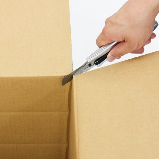 ダンボール箱の深さ方向に対し、2本の折れ線(罫線)を設けた。箱の四隅にカッターなどで切れ込みを入れることで、深さ調整が可能となる。