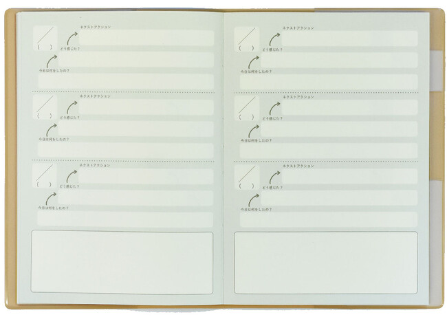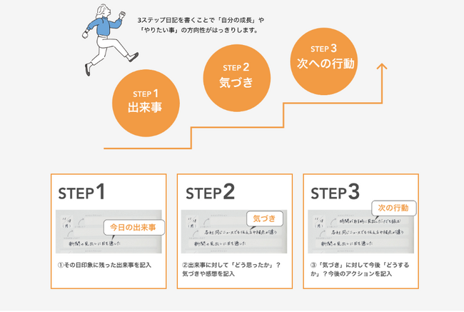 3STEP日記は「出来事」「気づき」「次への行動」を3行で可視化する日記です。1項目につき、3つの質問を自分自身へ問いかけながら記入する事で内省を促し、自身の思考、感情、信念、目標などについて継続的に考える習慣を身につける事が可能だと当社では捉えています。