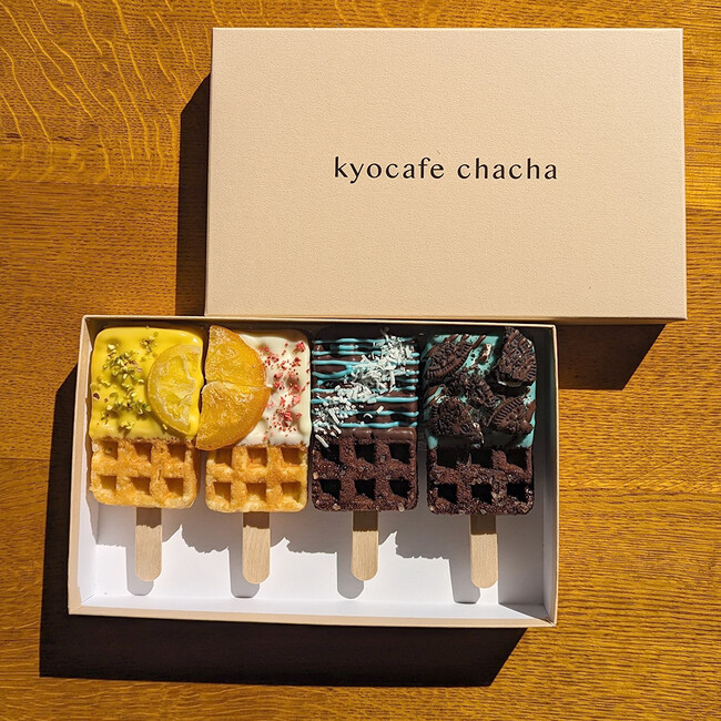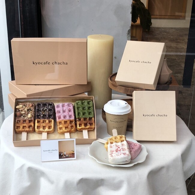 「kyocafe chacha」について2017年4月より京都で運営しているワッフル専門店「kyocafe chacha」では、可愛くって食べやすいバータイプの新感覚ワンハンドスイーツ「京ワッフル」を販売しております。