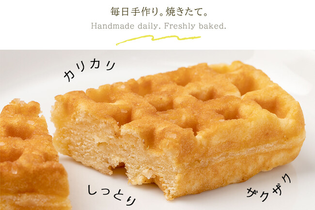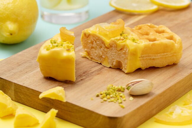大粒ザラメをたっぷり練り込んだ、しっとりなめらかな京ワッフルの生地。噛んだ瞬間「パキッ」と音が鳴るほど分厚くディップしたレモン風味のチョコレートの上から、瀬戸内産ドライレモンをトッピングし、ピスタチオを散りばめたフレーバー。
