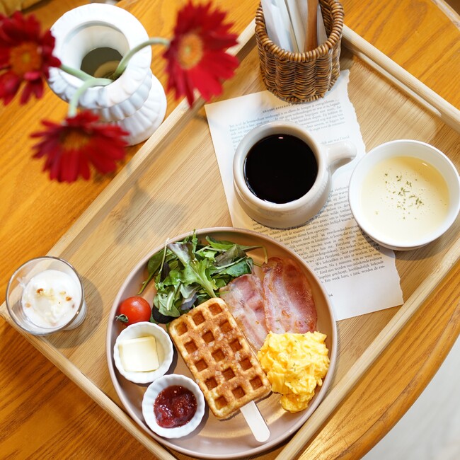 店内では、ここでしか食べられない、kyocafe chachaオリジナルの〈モーニングプレート(なくなり次第終了)〉や、カフェタイムには京ワッフルと季節のフルーツ等を使った〈こだわりのスイーツプレート〉をお楽しみいただけます