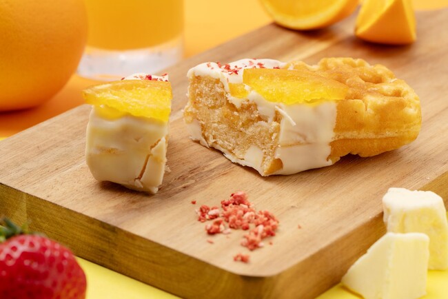 大粒ザラメをたっぷり練り込んだ、しっとりなめらかな京ワッフルの生地。噛んだ瞬間「パキッ」と音が鳴るほど分厚くディップしたホワイトチョコレートの上から、ドライオレンジをトッピングし、ドライストロベリーを散りばめたフレーバー。