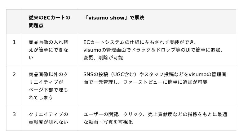 一方で、多くの EC カートシステムでは、多様なクリエイティブ素材の収集や掲載に高コストな開発対応が必要な場合や、表示順の調整に手間がかかるなど、柔軟な運用が難しいのが現状です。また写真の表示順の調整や最適なコンテンツ選定も担当者の感覚頼みになりがちで、