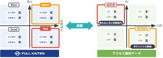 今ある在庫での売上・粗利・キャッシュフローの最大化を支援する在庫分析クラウド『FULL KAITEN』を展開するフルカイテン株式会社(本社・大阪市福島区、代表取締役・瀬川直寛)は、ECのCVR(コンバージョン)やPV(ページビュー)などのアクセス解析データと、FULL KAITENの商品軸の予測値を掛け合わせ、売上と粗利に繋がる見込みの高い過剰在庫を可視化するFULL KAITEN〈販売強化for EC〉の提供を開始しました。