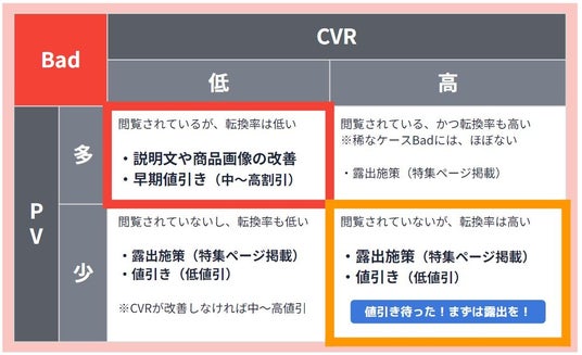 Bad在庫の中から、PVは多いがCVRが低い(閲覧されているのに購入に至っていない)商品の商品ページ改善または早期値引きにより、売るべき商品で売上・粗利を創出。