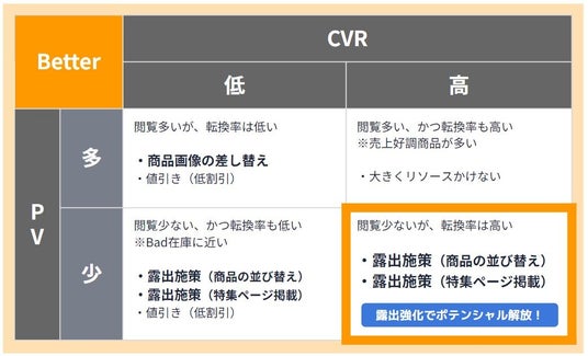 Better在庫の中から、PVは少ないがCVRが高い(閲覧は少ないが購入されている)商品を露出強化することで、売るべき商品で売上・粗利を創出。