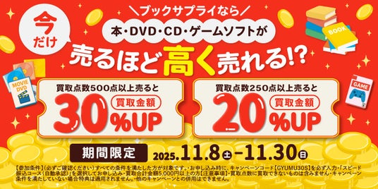 ブックサプライでは、買取点数に応じて買取金額がアップする期間限定キャンペーンを実施します。本・DVD・CD・ゲームソフトなどが対象で、