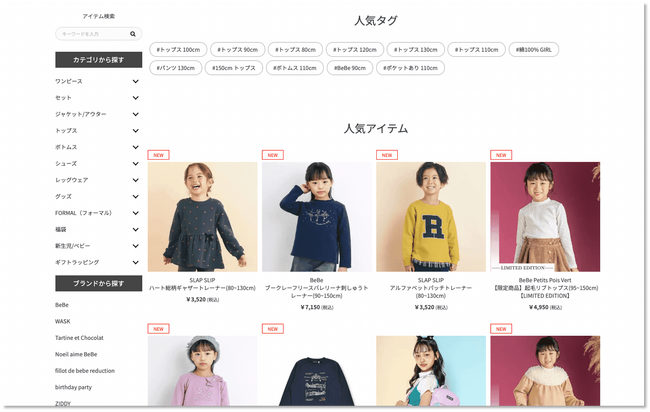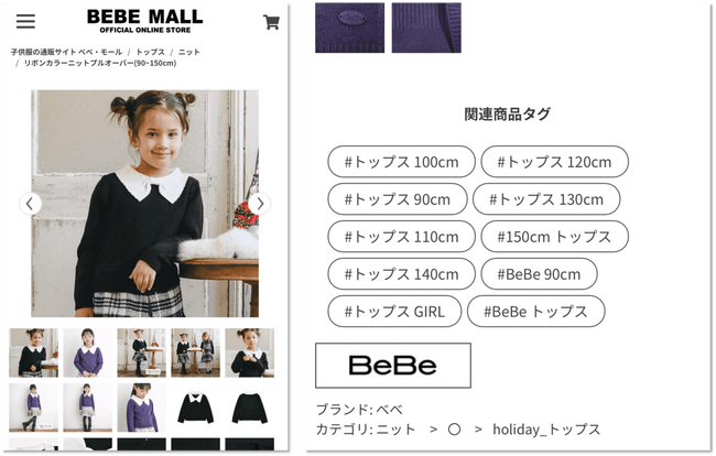 ▼「BEBE MALL OFFICIAL ONLINE STORE」での awoo AI 活用イメージ「大人のファッションの楽しさをそのまま子供服へ」というコンセプトのもと、独自のスタイルで高品質・高機能の子供服を提供するベベ。