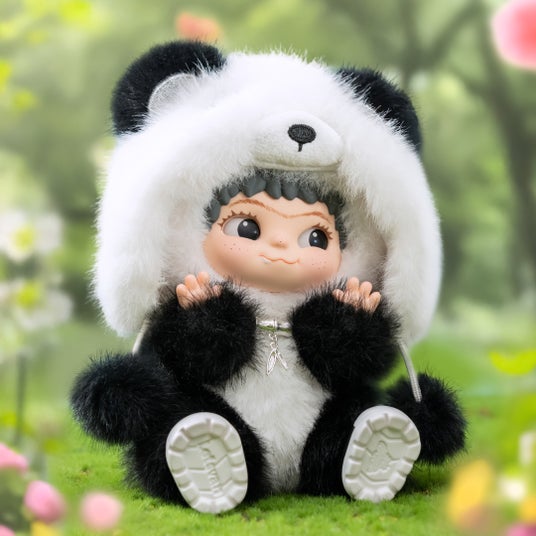 白黒カラーの体毛とパンダの顔つき帽子、竹のネックレスがポイント!
