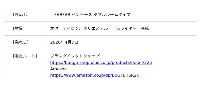 プラス株式会社(東京都港区 代表取締役社長 今泉忠久)は、生地の美しい表情に着目したブランド「FABFAB(ファブファブ)」から、筆記具を眺めるためのペンケース「FABFAB ペンケース ダブルルームタイプ」を2026年4月7日にプラスダイレクトショップおよびAmazonにて販売を開始します。
