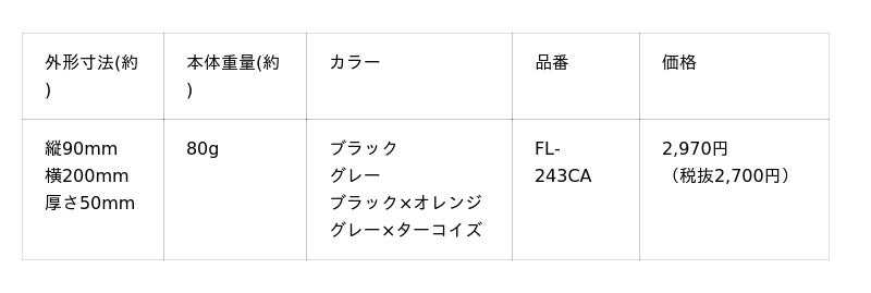 カラーは、ブラック、グレー、ブラック×オレンジ、グレー×ターコイズの4種類。メーカー希望小売価格(税込)は、2,970円です。