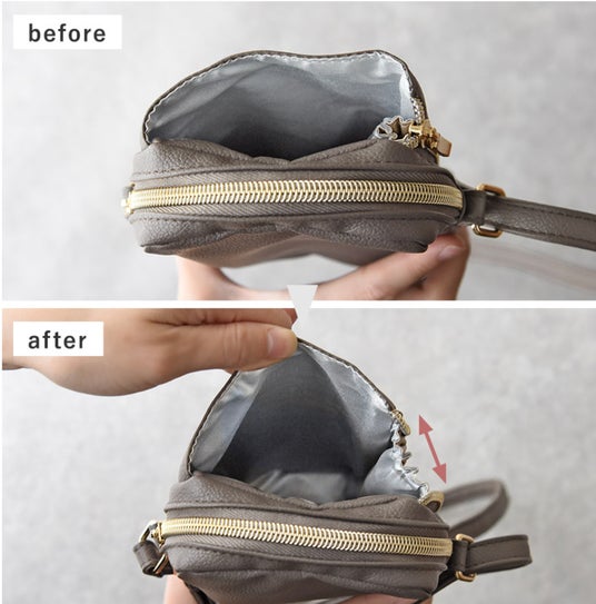 通常時はかさばらない「ペタンコ設計」ですが、サイドにあるファスナーを開くとマチが登場!ペットボトルも収納できる、ボトルホルダー形状に早変わりします。