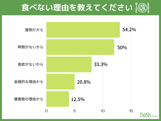 次に「食べない」と回答した人に理由を質問しました。「面倒だから」54.2%、「時間がないから」50%、「食欲がないから」33.3%、「金銭的な理由から」20.8%、「健康面の理由から」12.5%という結果となりました。食欲はあるものの、用意をする手間や時間がネックとなっていることがわかります。