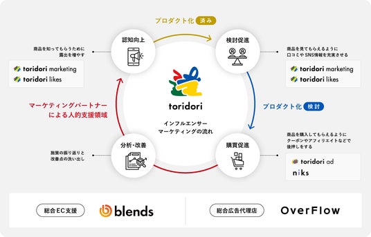 toridoriのディレクションの元、toridoriグループのniks(インフルエンサー特化の成果報酬型広告)、blends(総合EC支援)、OverFlow(ブランディング・総合代理店)が連携し、TikTok上で総合型のSNSコマース支援体制を構築し、EC企業のクライアント様を包括的にサポートいたします。