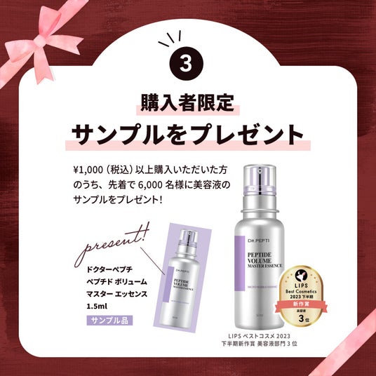『LIPSショッピング』で1,000円(税込)以上を購入いただいた方のうち、先着6,000名様に「DR.PEPTI ペプチド ボリューム マスター エッセンス」のサンプルをプレゼントします。