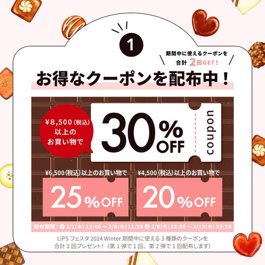 「LIPSフェスタ 2024 Winter」について2024年2月1日(木)12:00より実施される「LIPSフェスタ 2024 Winter」では、クーポン配布はもちろんのこと一部対象商品の購入ポイント還元率が大幅UPするなど、ご愛顧いただく多くのユーザーに喜んでいただけるものを企画しています。