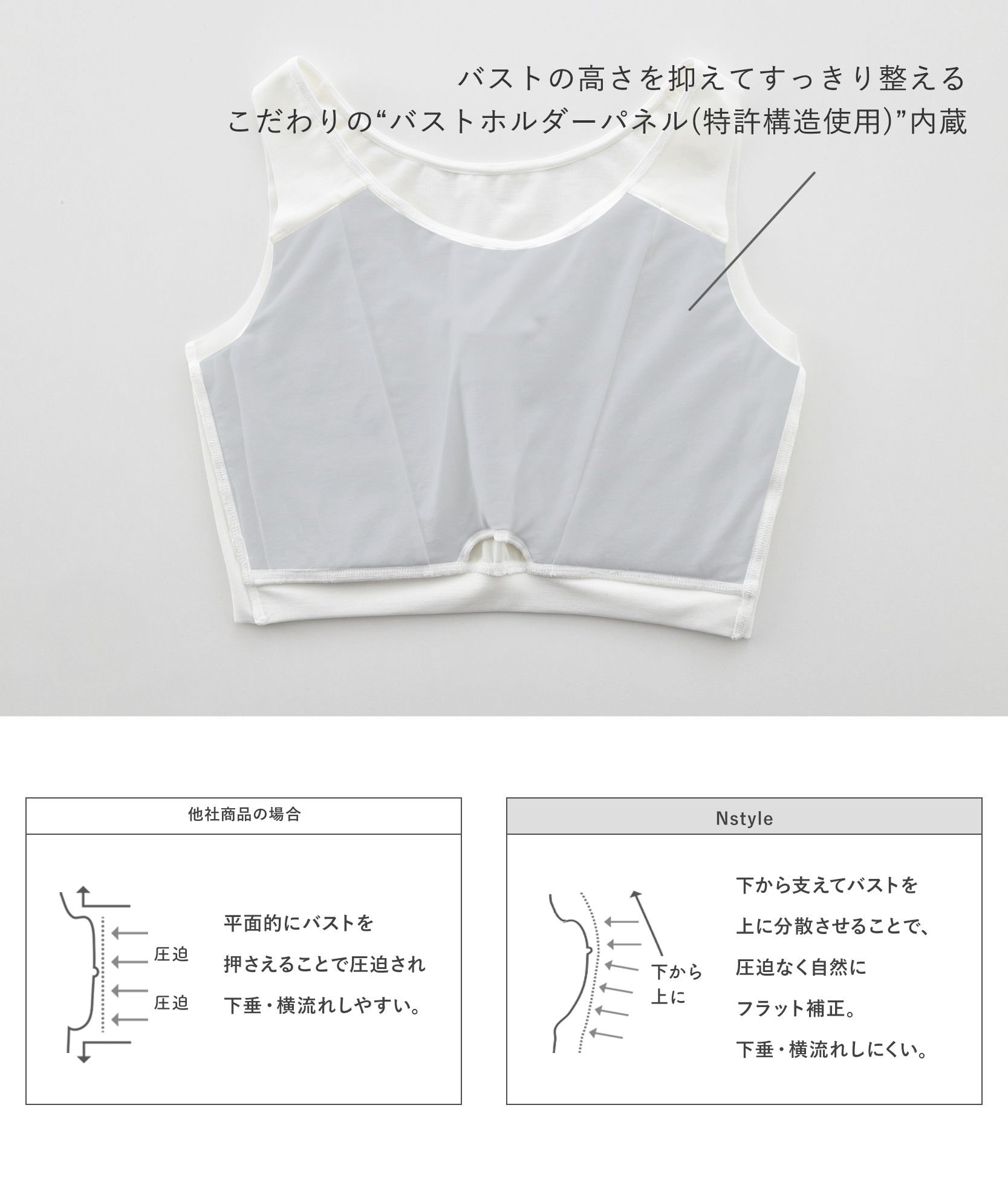 バストを下から支えて上に分散させることで圧迫することなく自然にフラット補正する、バストフラットインナー「Nstyle」。2025年6月のリニューアルにより吸水速乾性が向上、さらに快適にアップデートしました。