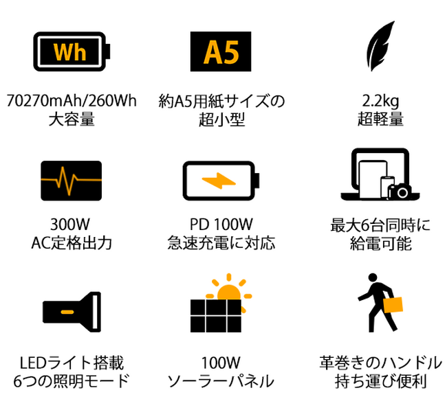 ・コンパクトなのに70270mAh/260Wh超大容量、300W 純正弦波 AC 出力。