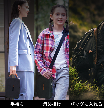 手持ちだけでなく、斜め掛けも可能。もちろんバッグに入れて持ち運ぶこともできます。