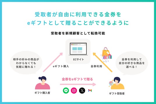 今回の新機能のリリースにより、商品券やクーポン券など店舗やECサイトで使える金券をeギフトで贈ることができるようになります。