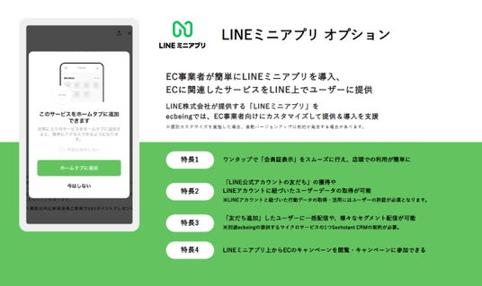 「ecbeing」を導入しているEC事業者様は簡単にLINEミニアプリを導入することが可能で、ライトユーザーとの接点構築に最適なソリューションです。