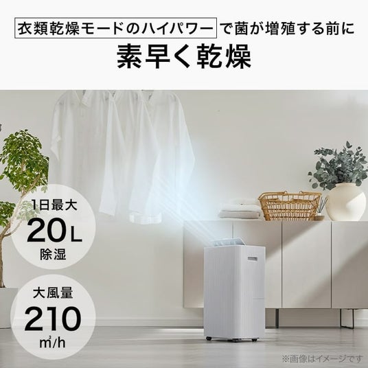 さらに、1日最大20Lの除湿能力に加え、衣類乾燥モードも搭載。花粉の影響で洗濯物を外に干しにくい時期には、部屋干しのサポートアイテムとしても活躍します。風を効率よく届けることで、室内干し時の空気のこもり感を軽減し、季節を問わず使いやすい一台です。