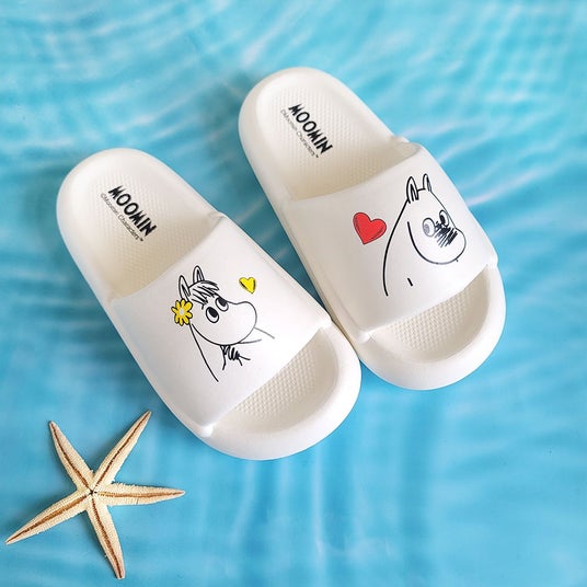 人気のふわふわスリッパに、ムーミンのイラストを。スノークのお嬢さん(フローレン)に照れるムーミンの表情がかわいい。