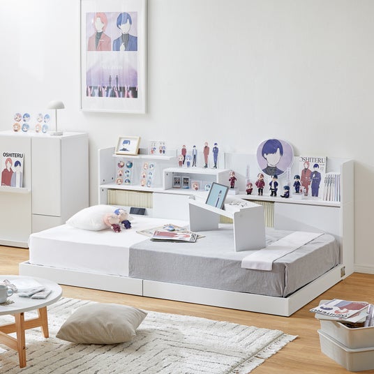 ベッド上でも“推し”と過ごす時間を快適にするために設計された。5つの特徴をもつ「OSHITERU(オシテル)ベッド」。なかでも、ヘッドボードにはアクスタや小物を飾れるミニギャラリー棚を備え、推しの世界観を身近に演出。さらに、引き出し式の“祭壇収納”により、グッズを美しくディスプレイしながら整理できます。