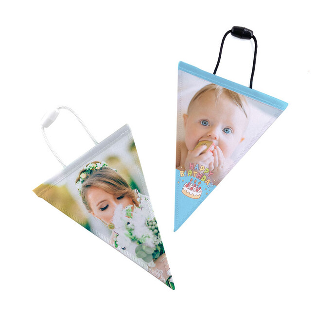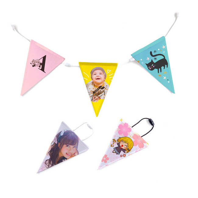 △写真・イラスト・文字・デザインなど自由にフルカラー印刷可能写真、イラスト、文字、デザインなど、お好みの要素を自由に組み合わせ、フルカラー印刷によって鮮やかな仕上がりを実現します。個性的でオリジナリティ溢れるガーランドで、イベントやパーティに独自の雰囲気をプラスしましょう。