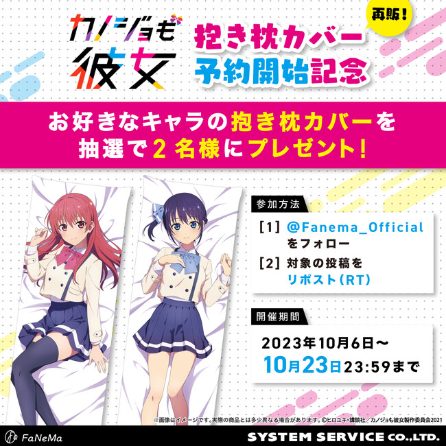 システムサービス株式会社(本社:東京都豊島区、代表取締役社長:田村宗弘)は、アニメ・マンガ・ゲーム作品等のキャラクター商品の企画・製作・販売をする自社ECサイト「FaNeMa」(URL:https://fanema.jp/)にて、TVアニメ『カノジョも彼女』より「抱き枕カバー」の再受注販売をいたします。