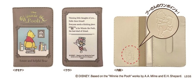 二つ折りのパスケースです。外側は本をイメージした大人っぽく上品なデザインで、内側には本を読みながら歩いているプーさんが型押しされています。内側のポケットにはカードを最大4枚収納できます。