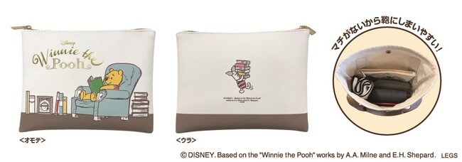 椅子に座ったプーさんが大きくデザインされたフラットポーチです。マチがないので、鞄の隙間にもすっきりしまうことが出来ます。