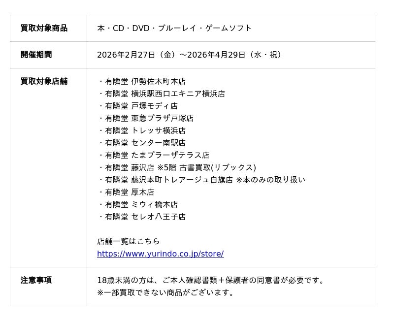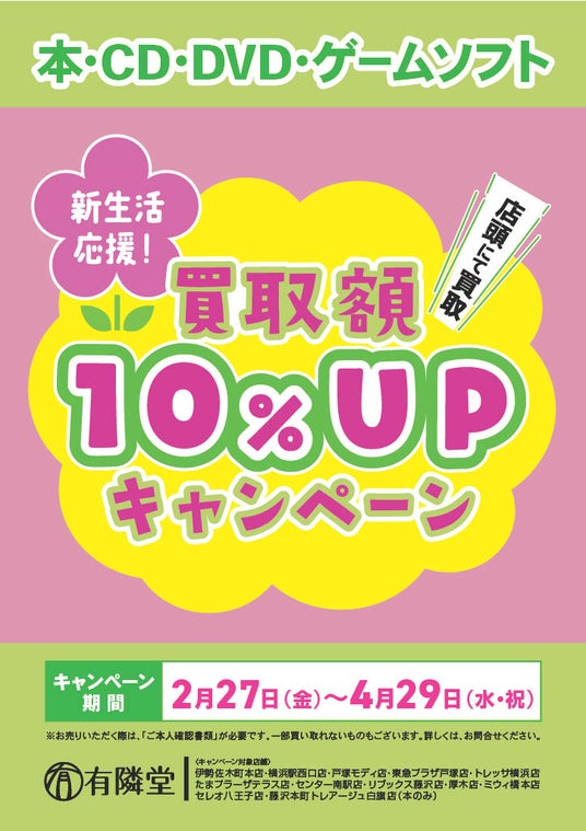株式会社ブックサプライ(本社:大阪府吹田市、代表:藪田真吾)が提供する買取システムを利用し、株式会社有隣堂(本社:神奈川県横浜市、代表取締役 社長執行役員:松信 健太郎)が運営する対象の12店舗で、2026年2月27日(金)から2026年4月29日(水・祝)までの期間限定で「買取金額10%UPキャンペーン」を実施いたします。