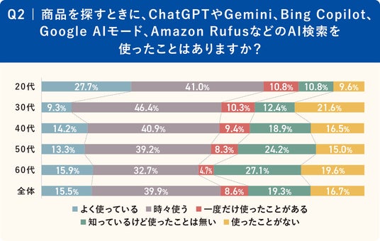 商品を探す際にChatGPT、Gemini、Bing Copilot、Google AIモード、Amazon RufusなどのAI検索を使用したことがある「経験値」は、全体で