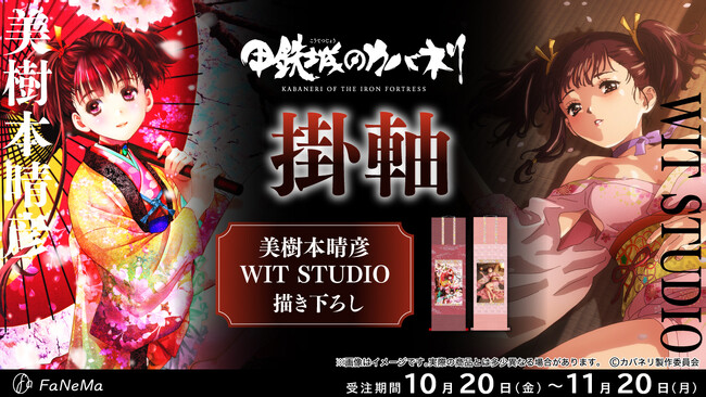 システムサービス株式会社(本社:東京都豊島区、代表取締役社長:田村宗弘)は、アニメ・マンガ・ゲーム作品等のキャラクター商品の企画・製作・販売をする自社ECサイト「FaNeMa」(URL:https://fanema.jp/)にて、『甲鉄城のカバネリ』より、美樹本晴彦氏(キャラクター原案)と「WIT STUDIO」(アニメーション制作)が本企画のために描き下ろした「本格日本掛軸」を発売いたします。