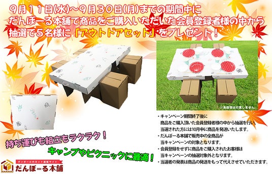 株式会社タチバナ産業株式会社タチバナ産業(埼玉県春日部市、代表取締役:野原将彦)は自社サイト「だんぼーる本舗」で、9月11日(水)~9月30日(月)の期間中「アウトドアセット」のプレゼントキャンペーンを開始します。