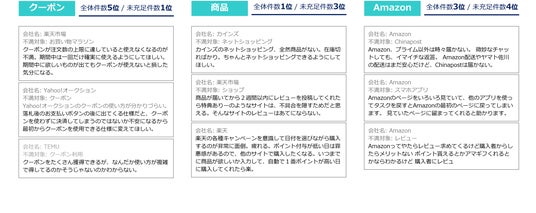 『不満ファインダー』のテキスト解析機能を用いて未充足割合が高いキーワードに関連する不満の原文を参照しながら、ECに対して抱いている不安や不満の特徴を整理しました。