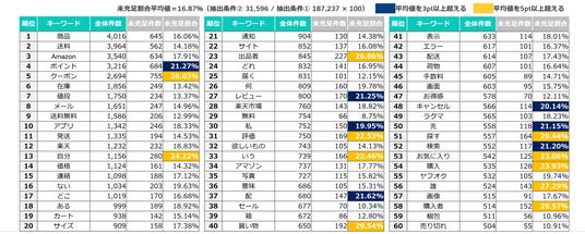抽出条件1.のキーワードランキングをベースに、全体件数に対するキーワード別の離反件数の割合を確認した。 「クーポン」「自分」「出品者」「評価」「買い物」「探す」「お気に入り」「購入」といったキーワードが未充足割合平均値を5pt以上上回る結果となった。