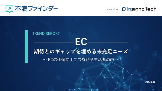 ▼レポートのダウンロードはこちら(無料でダウンロードいただけます)https://insight-tech.co.jp/downloads/24_ec■不満買取センターとは(https://fumankaitori.com/)不満買取センター(特許取得済み)は、「企業の商品やサービス、そして社会をより良くするために、あなたの不満を買い取ります。あなたの不満の中に眠った”ヒント”を私たちが企業や社会に届けます」をコンセプトに、2015年3月18日からサービス開始をしております。Webサービス及びスマートフォンアプリを通して生活者からの不満の声を収集しており、現在累計74万人以上の会員から、累計4,300万件以上の不満を買い取っています。