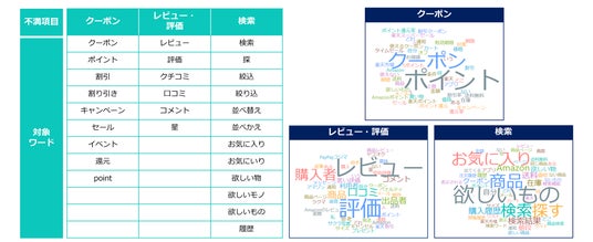 未充足割合が特に高かった「クーポン」「レビュー・評価」「検索」を対象に独自の辞書を設定した。 不満項目毎に優先課題図を作成し、それぞれの特徴的な課題を確認する。