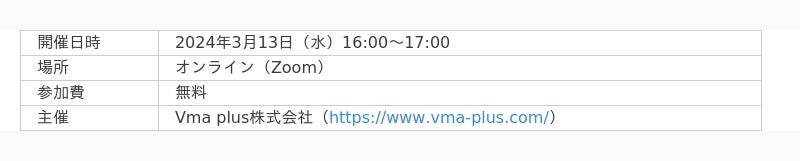 メタバースとWeb3.0に関するイベント企画やコンテンツ作成、そのディレクションを手がけるVma plus(ブイマプラス)株式会社(本社:東京都品川区、代表:津田徹)は、この度『ビジネスを変革するメタバース活用』をテーマにしたセミナーをオンライン形式で2024年3月13日(水)に開催いたします。