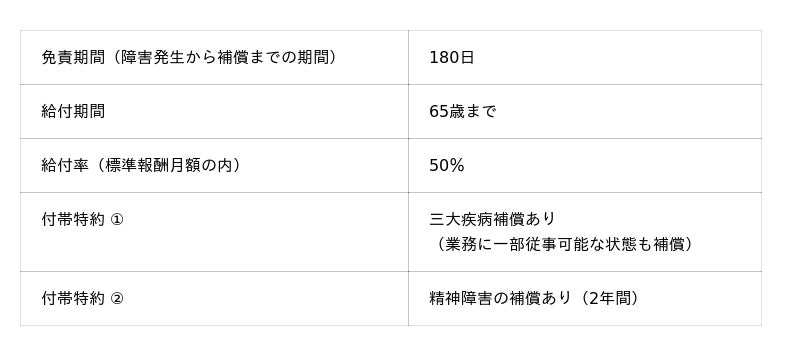 さらに、三大疾病(がん、急性心筋梗塞、脳卒中)は補償条件を緩和しています。通常は免責期間の180日間就業不能状態が継続すると補償されますが、三大疾病の場合は制限勤務等で業務に一部従事可能な状態でも免責期間とし、期間後の補償対象になります。